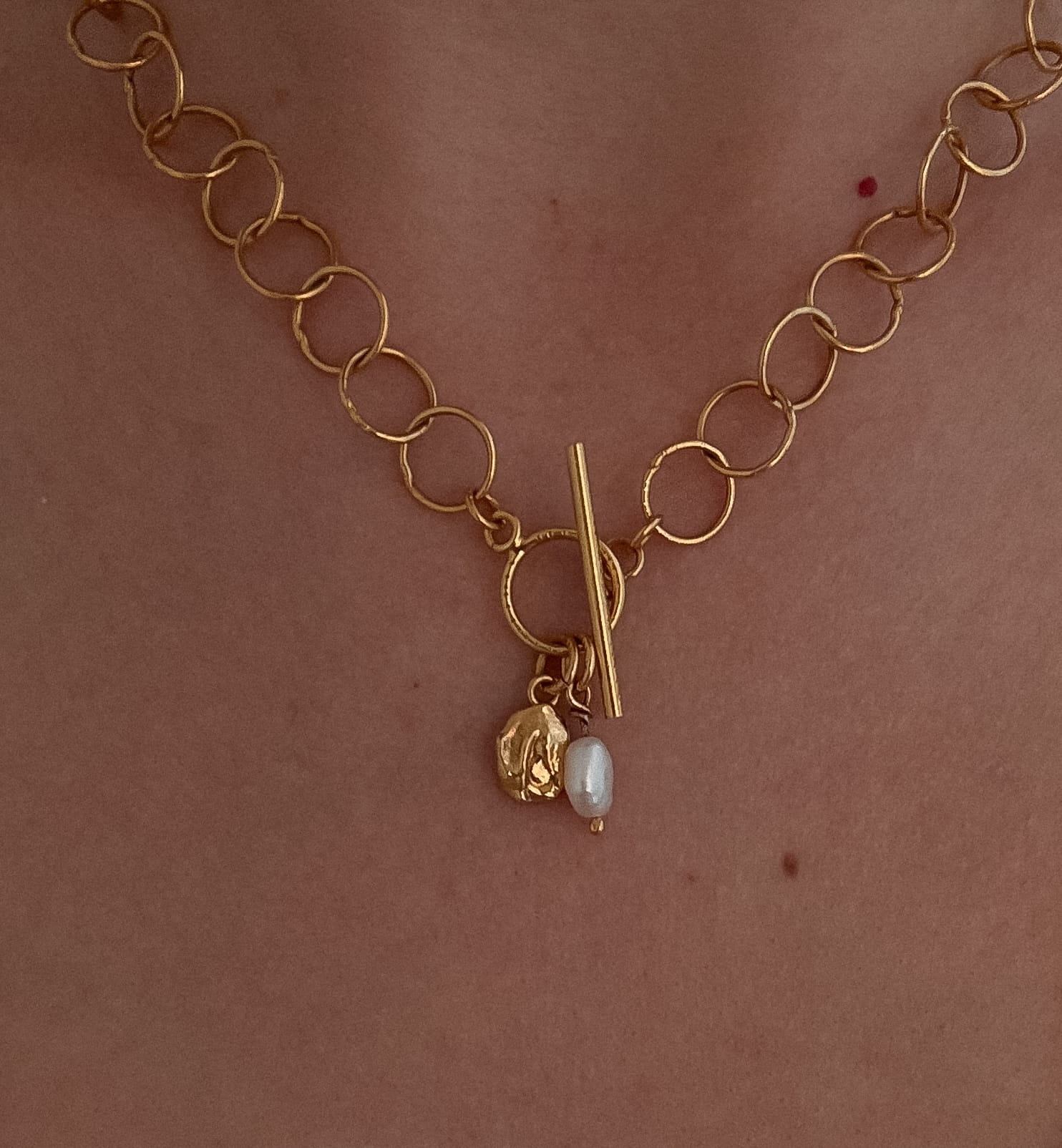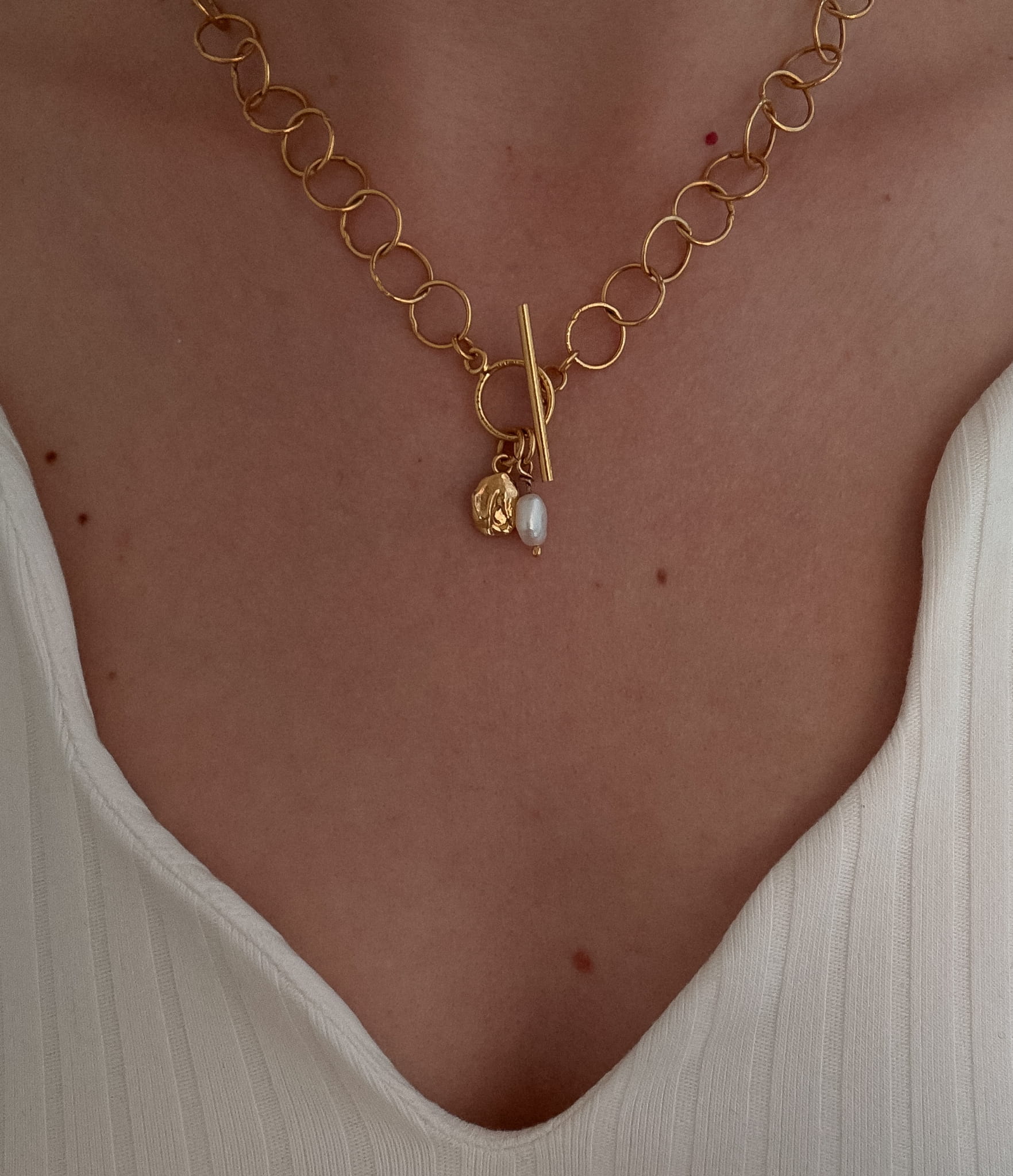 Naszyjnik ma 3 zawieszki - perełka srebrna złocona, maleńki medalik, wyjątkowa perełka hodowlana